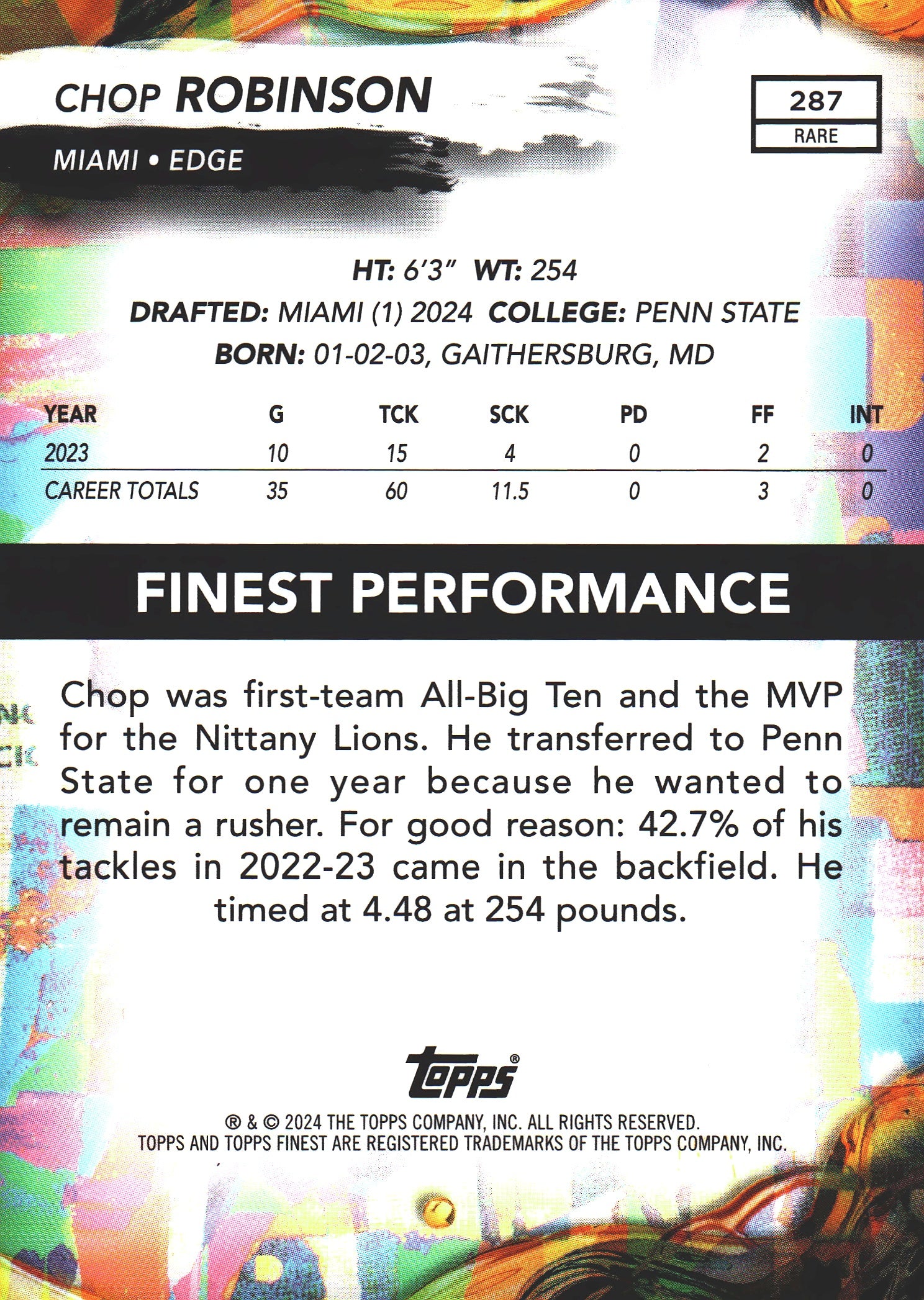 2024 Topps Finest Rare Gold /20 Chop Robinson RC #287 Miami Dolphins