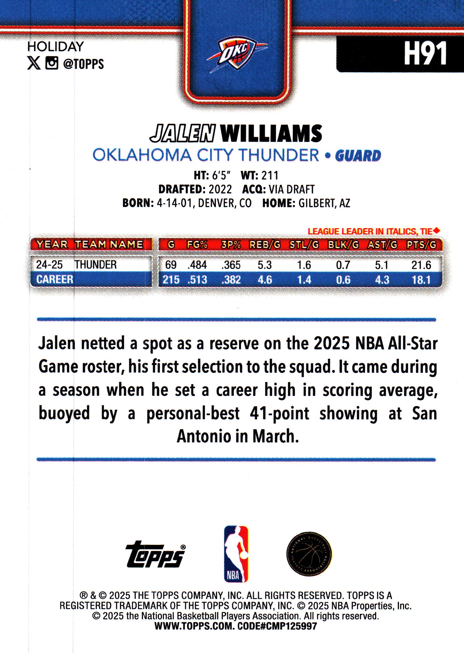 2025 Topps Holiday Glitter Jalen Williams #H91 Oklahoma City Thunder