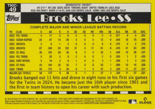 2025 Topps Series 1 Mojo 1990 Topps Baseball 35th Anniversary Chrome Brooks Lee Minnesota Twins #T90C-49