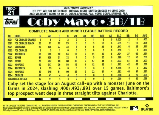 2025 Topps Series 1 Mojo 1990 Topps Baseball 35th Anniversary Chrome Coby Mayo Baltimore Orioles #T90C-21