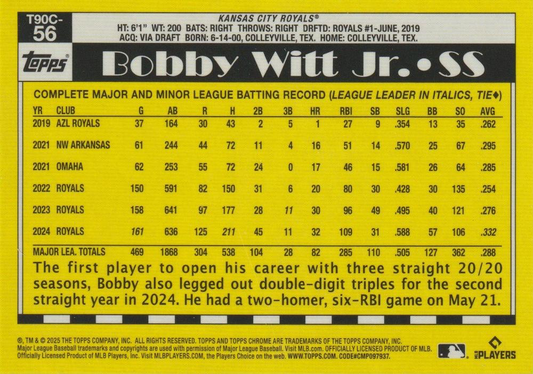 2025 Topps Series 1 Mojo 1990 Topps Baseball 35th Anniversary Chrome Bobby Witt Jr. Kansas City Royals #T90C-56