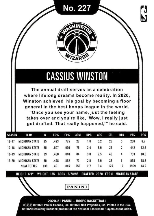 2020 Panini Hoops Cassius Winston RC #227 Washington Wizards