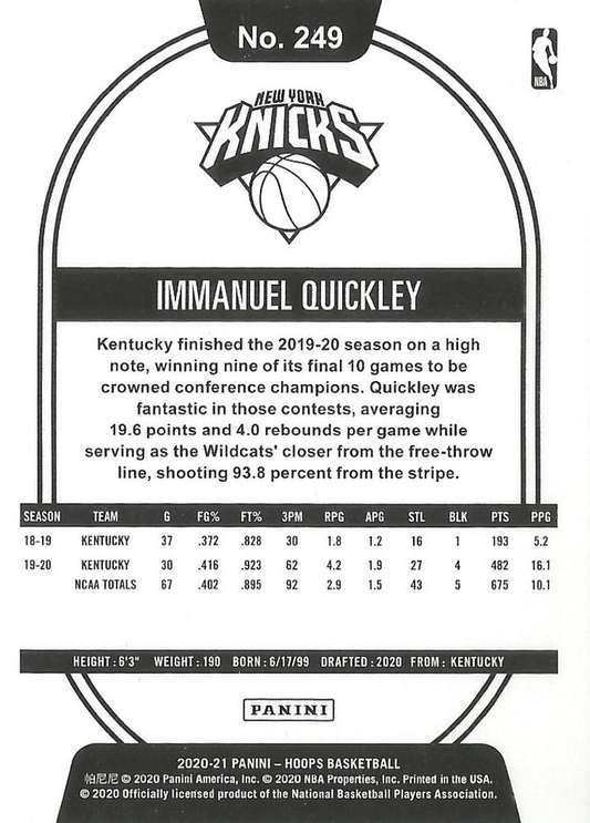 2020 Panini Hoops Immanuel Quickley RC #249 New York Knicks