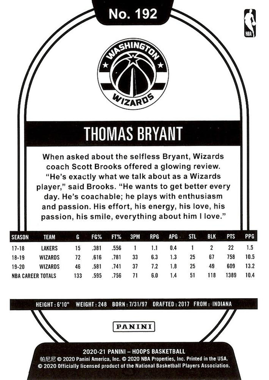 2020 Panini Hoops Thomas Bryant #192 Washington Wizards