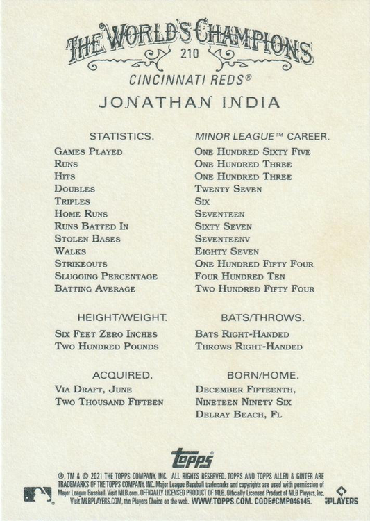 2021 Topps Allen & Ginter Jonathan India RC Cincinnati Reds #210