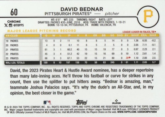 2024 Topps Chrome RayWave Refractor Parallel David Bednar Pittsburgh Pirates #60