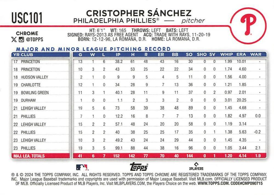 2024 Topps Chrome Update X-Fractor Parallel Cristopher Sánchez Philadelphia Phillies #USC101