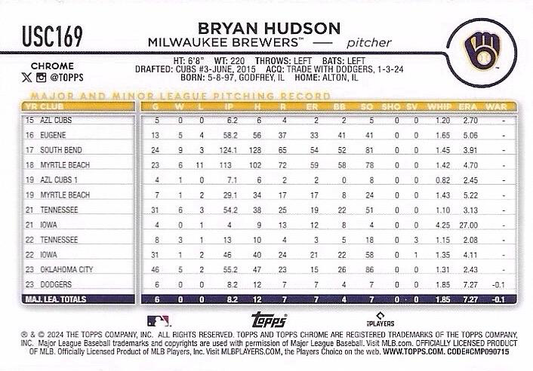 2024 Topps Chrome Update X-Fractor Parallel Bryan Hudson RC Milwaukee Brewers #USC169