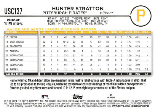 2024 Topps Chrome Update X-Fractor Parallel Hunter Stratton RC Pittsburgh Pirates #USC137