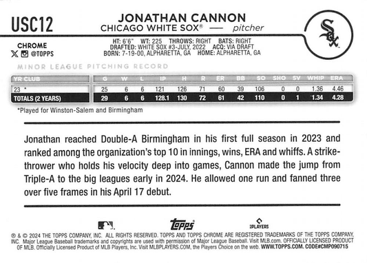 2024 Topps Chrome Update Jonathan Cannon RC Chicago White Sox #USC12