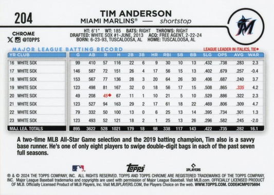 2024 Topps Chrome Tim Anderson Miami Marlins #204