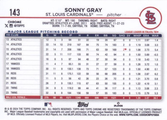 2024 Topps Chrome Sonny Gray St. Louis Cardinals #143