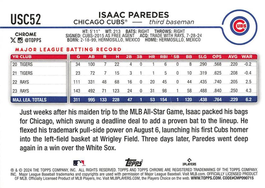 2024 Topps Chrome Update RayWave Refractor Parallel Isaac Paredes Chicago Cubs #USC52