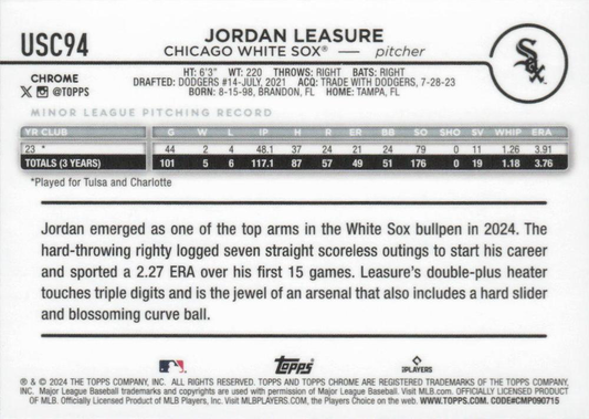 2024 Topps Chrome Update X-Fractor Parallel Jordan Leasure RC Chicago White Sox #USC94