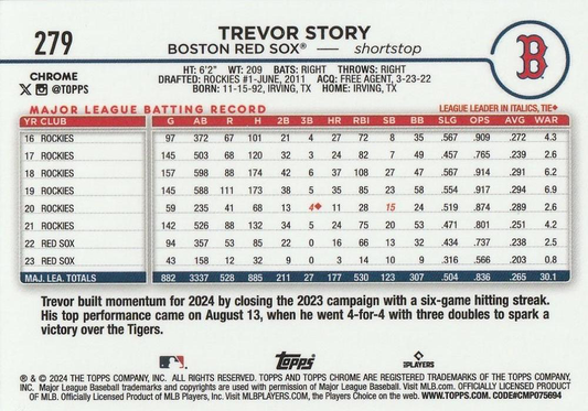 2024 Topps Chrome X-Fractor Parallel Trevor Story Boston Red Sox #279