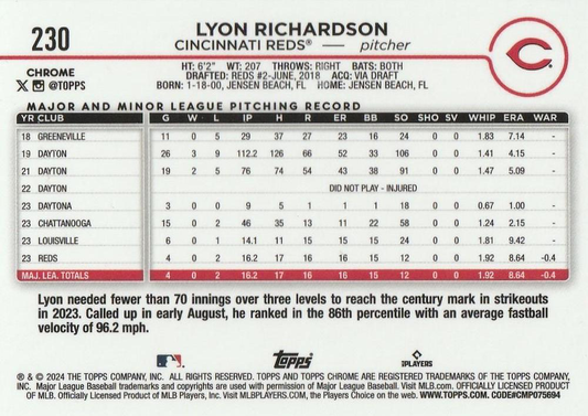 2024 Topps Chrome X-Fractor Parallel Lyon Richardson RC Cincinnati Reds #230