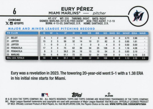 2024 Topps Chrome X-Fractor Parallel Eury Pérez Miami Marlins #6