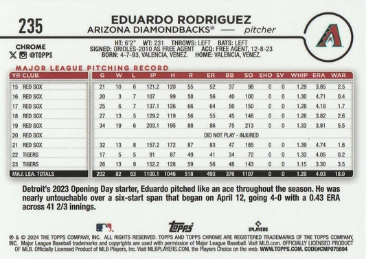 2024 Topps Chrome X-Fractor Parallel Eduardo Rodriguez Arizona Diamondbacks #235