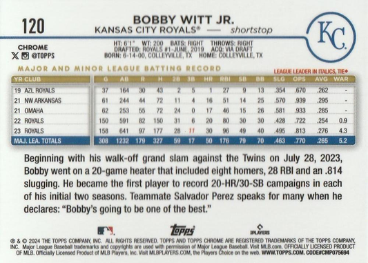 2024 Topps Chrome X-Fractor Parallel Bobby Witt Jr. Kansas City Royals #120