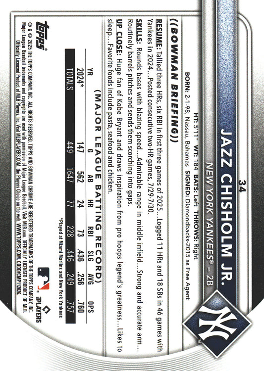 2025 Topps Bowman Chrome Jazz Chisholm Jr Fuchsia /299 #34 New York Yankees