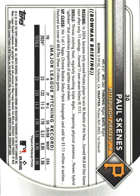 2025 Topps Bowman Chrome Paul Skenes Fuchsia Wave /299 #30 Pittsburgh Pirates