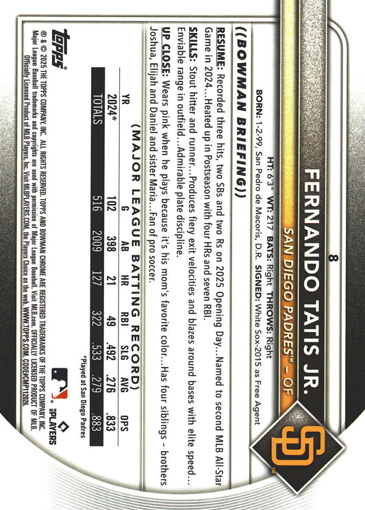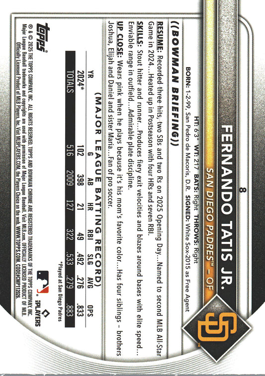 2025 Topps Bowman Chrome Fernando Tatis Jr Blue /150 #8 San Diego Padres