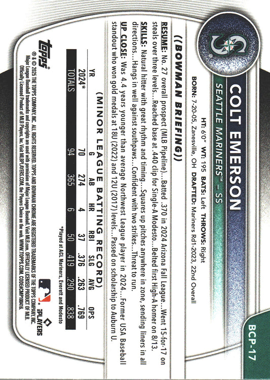 2025 Topps Bowman Chrome Colt Emerson Yellow X-Fractor /75 #BCP-17 Seattle Mariners
