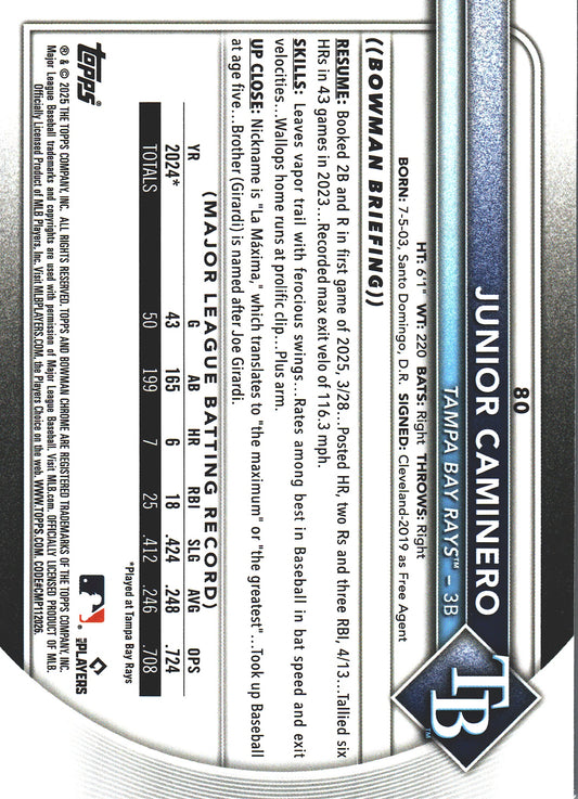 2025 Topps Bowman Chrome Junior Caminero Blue /150 #80 Tampa Bay Rays