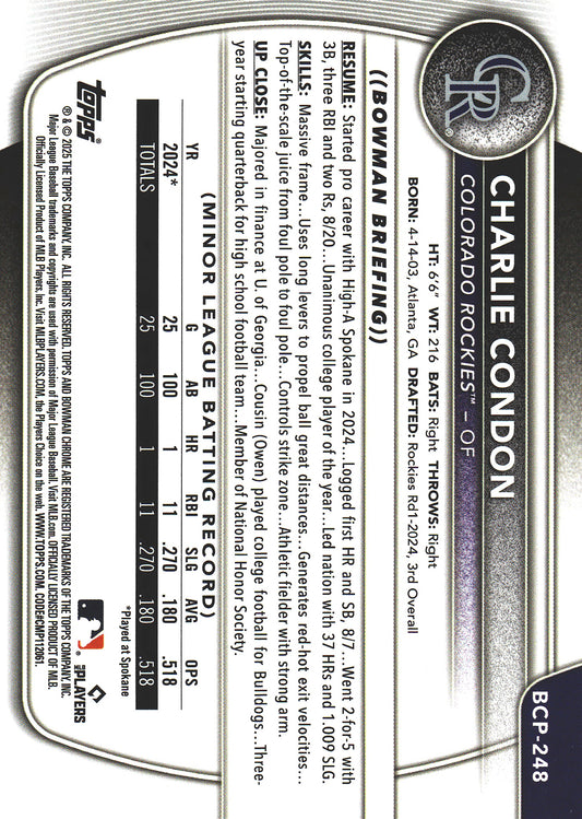 2025 Topps Bowman Chrome Prospect Charlie Condon Aqua Pulsar /125 #BCP-248 Colorado Rockies