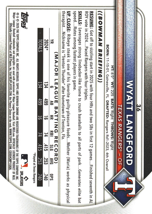 2025 Topps Bowman Chrome Wyatt Langford Green /99 #26 Texas Rangers