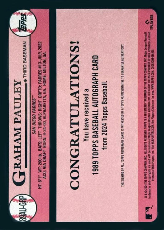 2024 Topps Update 1989 35th Anniversary Autograph Graham Pauley AU #89AU-GRP San Diego Padres
