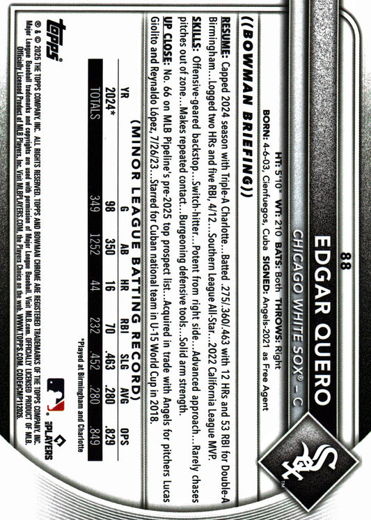 2025 Topps Bowman Chrome Yellow /75 Edgar Quero #88 Chicago White Sox