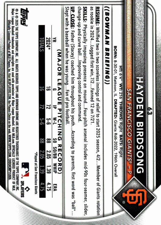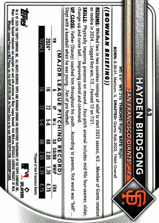2025 Topps Bowman Chrome Fuchsia /299 Hayden Birdsong #63 San Francisco Giants