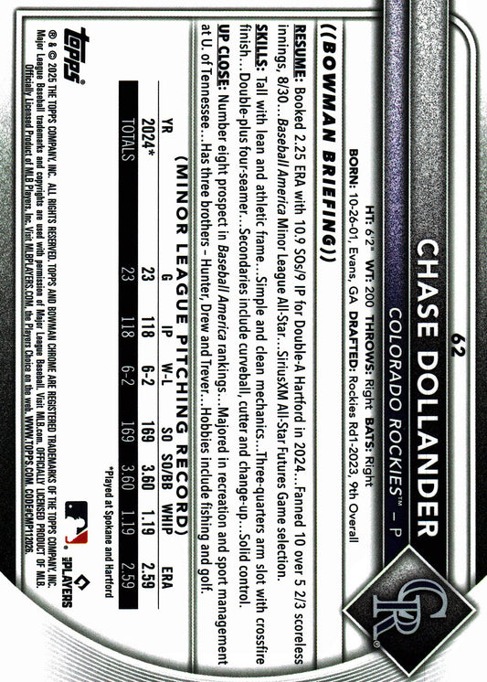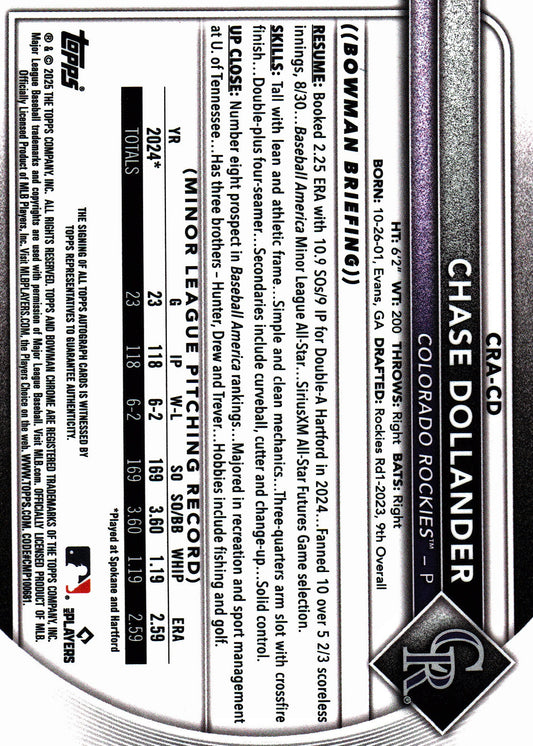 2025 Topps Bowman Chrome Rookie Autographs Chase Dollander #CRA-CD Colorado Rockies