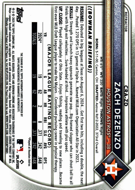 2025 Topps Bowman Chrome Rookie Autographs Refractor /499 Zach Dezenzo #CRA-ZD Houston Astros
