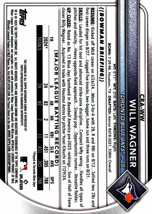 2025 Topps Bowman Chrome Rookie Autographs Will Wagner #CRA-WW Toronto Blue Jays