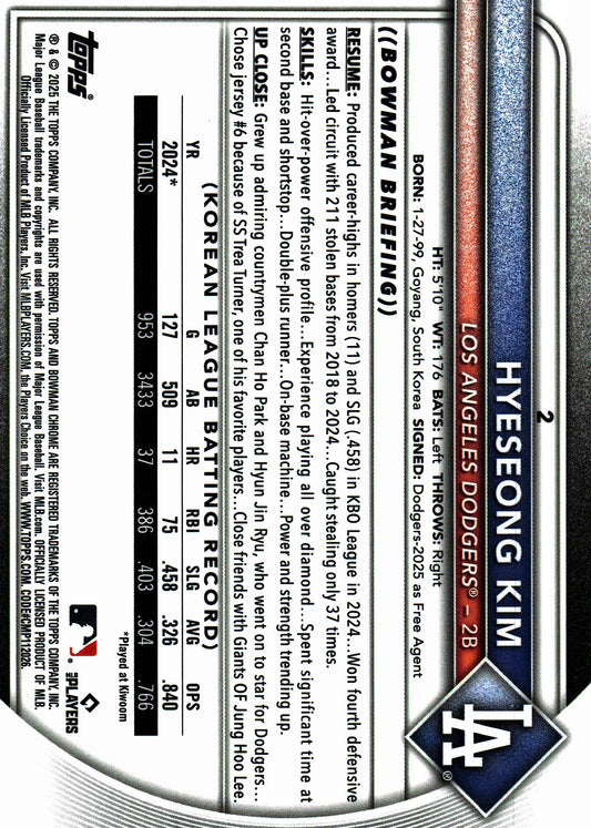 2025 Topps Bowman Chrome Purple Geometric /250 Hyeseong Kim #2 Los Angeles Dodgers
