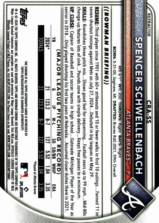 2025 Topps Bowman Chrome Rookie Autographs Refractor /499 Spencer Schwellenbach #CRA-SS Atlanta Braves