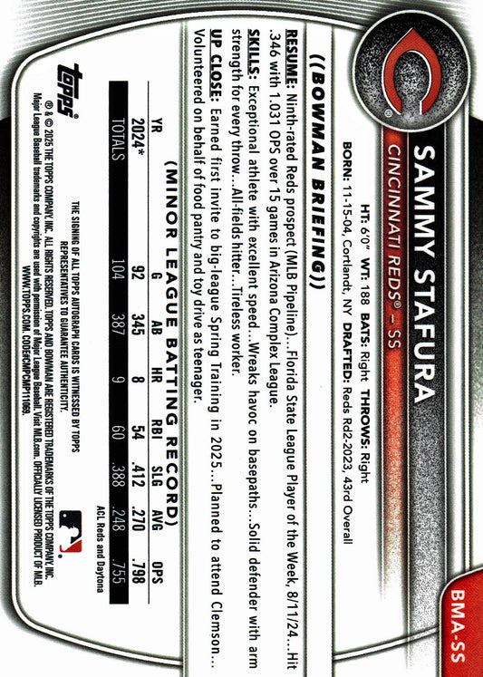 2025 Topps Bowman Chrome Prospect Autographs Mojo Sammy Stafura AU #CPA-SS Cincinnati Reds