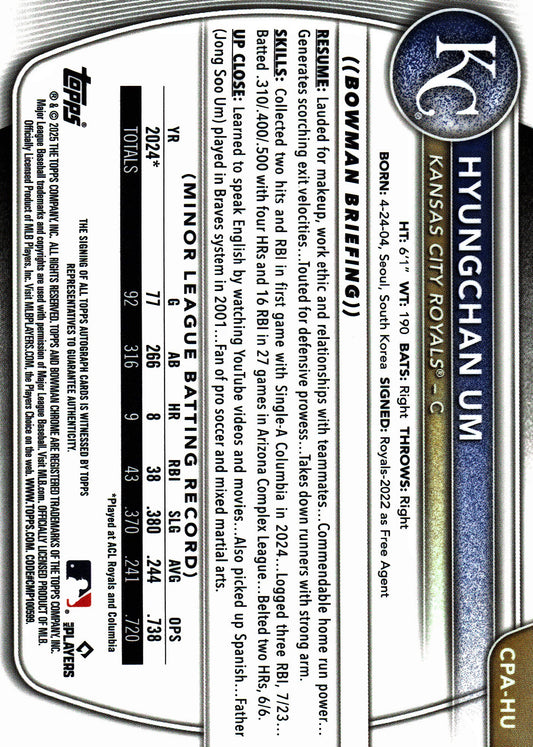 2025 Topps Bowman Chrome Prospect Autographs Hyungchan Um AU #CPA-HU Kansas City Royals