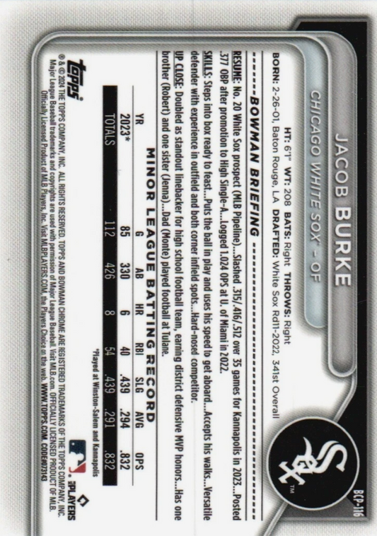 2024 Topps Bowman Chrome Prospects Lunar Glow Refractors 1ST Jacob Burke Chicago White Sox #BCP-116
