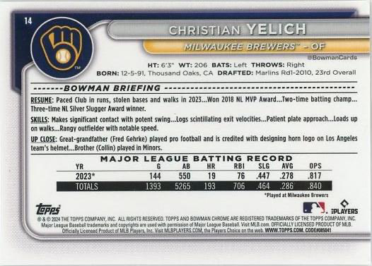 2024 Topps Bowman Chrome Christian Yelich Milwaukee Brewers #14