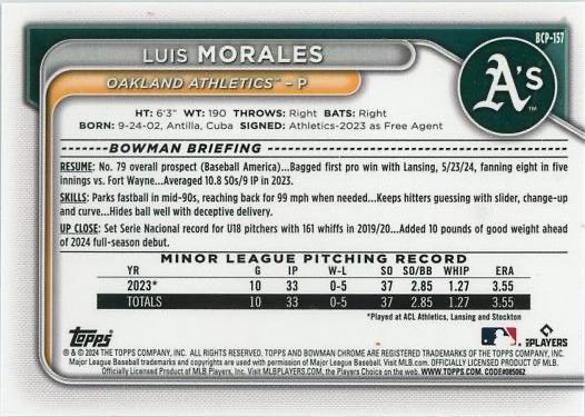 2024 Topps Bowman Chrome Prospects 1ST Luis Morales Oakland Athletics #BCP-157