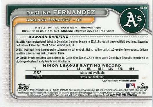 2024 Topps Bowman Chrome Prospects 1ST Darling Fernandez Oakland Athletics #BCP-184
