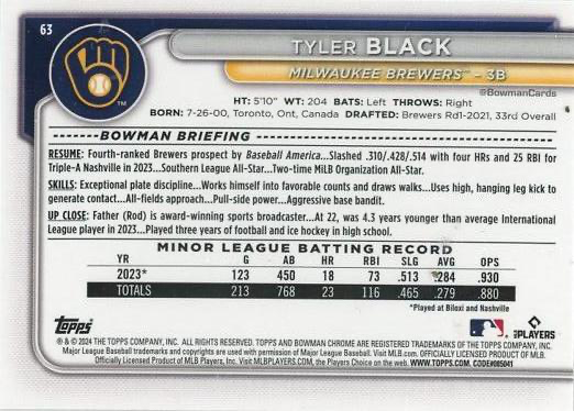2024 Topps Bowman Chrome Tyler Black RC Milwaukee Brewers #63