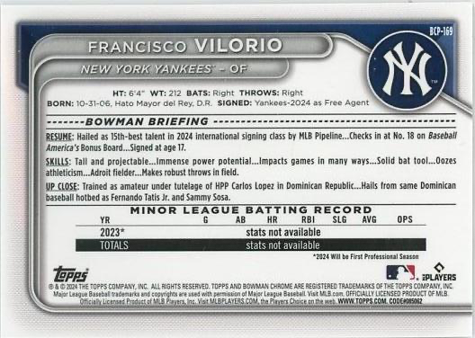 2024 Topps Bowman Chrome Prospects 1ST Francisco Vilorio New York Yankees #BCP-169