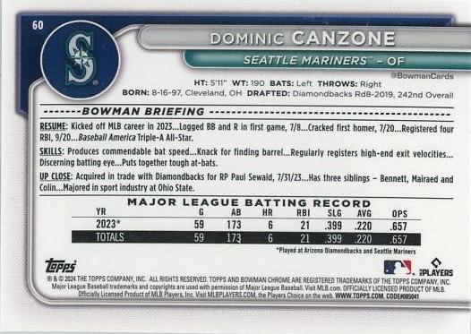 2024 Topps Bowman Chrome Dominic Canzone RC Seattle Mariners #60