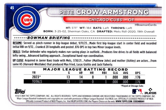 2024 Topps Bowman Chrome Pete Crow-Armstrong RC Chicago Cubs #45