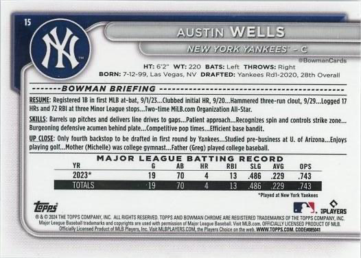 2024 Topps Bowman Chrome Austin Wells RC New York Yankees #15