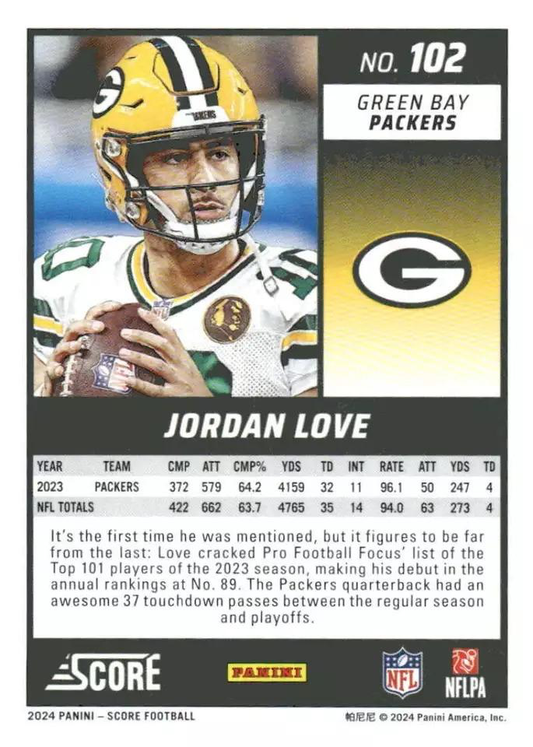 2024 Panini Score Football Jordan Love Green Bay Packers #102